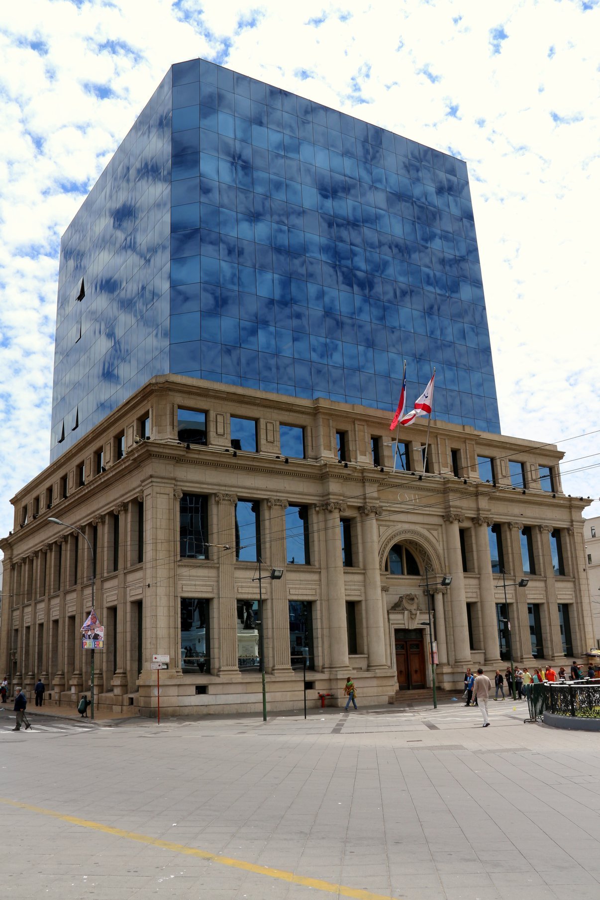 Outra particularidade da Plaza Sotomayor é a arquitetura dos prédios do entorno que misturam o moderno com o antigo. O edifício que chama a atenção para esse detalhe é o da Compañia Sudamericana de Vapores. Parte da enorme estrutura é formada por vidraças que refletem as cores e nuvens do céu.